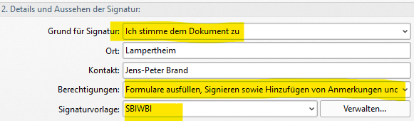 - Den Grund für die Signatur wählen (kann bei jeder Signatur geändert werden), die Berechtigungen wie hier angegeben einstellen (sonst kann ggf. niemand weiteres signieren) und die Signaturvorlage auf SBIWBI stellen
