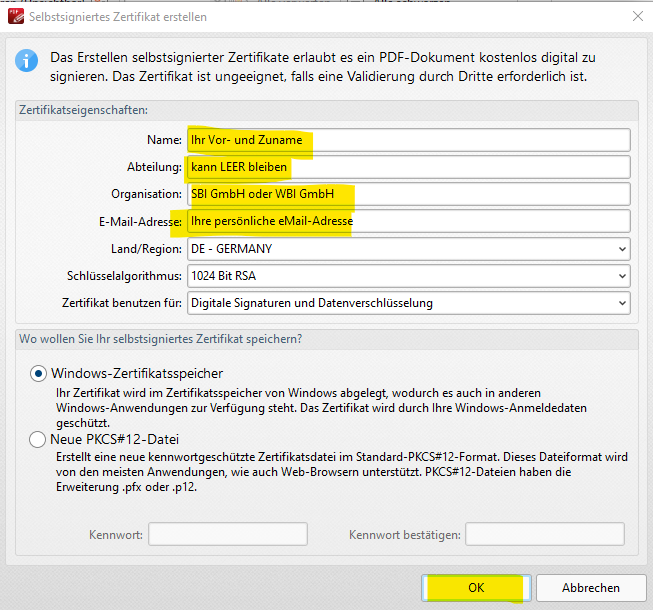 - das selbstgignierte Zertifikat ausfüllen und mit OK bestätigen